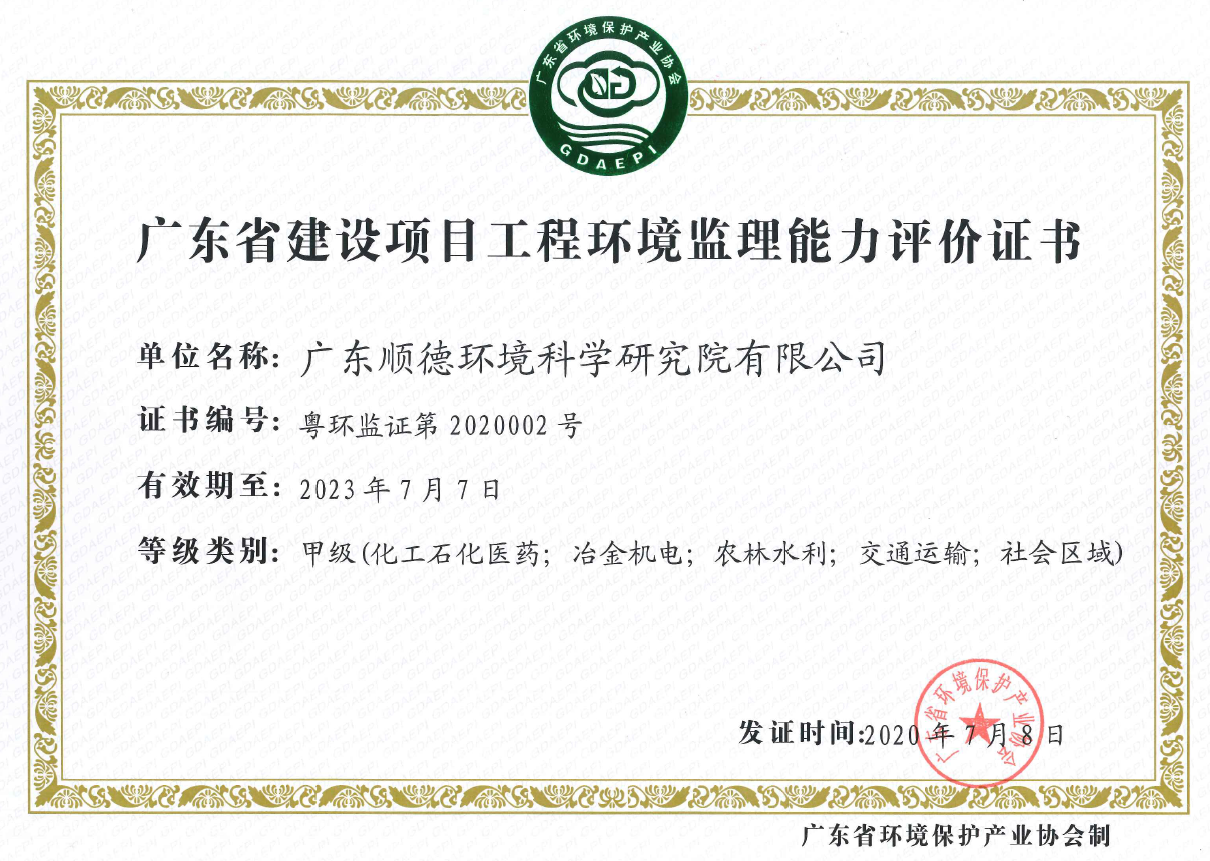 廣東省建設(shè)項(xiàng)目工程環(huán)境監(jiān)理能力評(píng)價(jià)證書(shū)