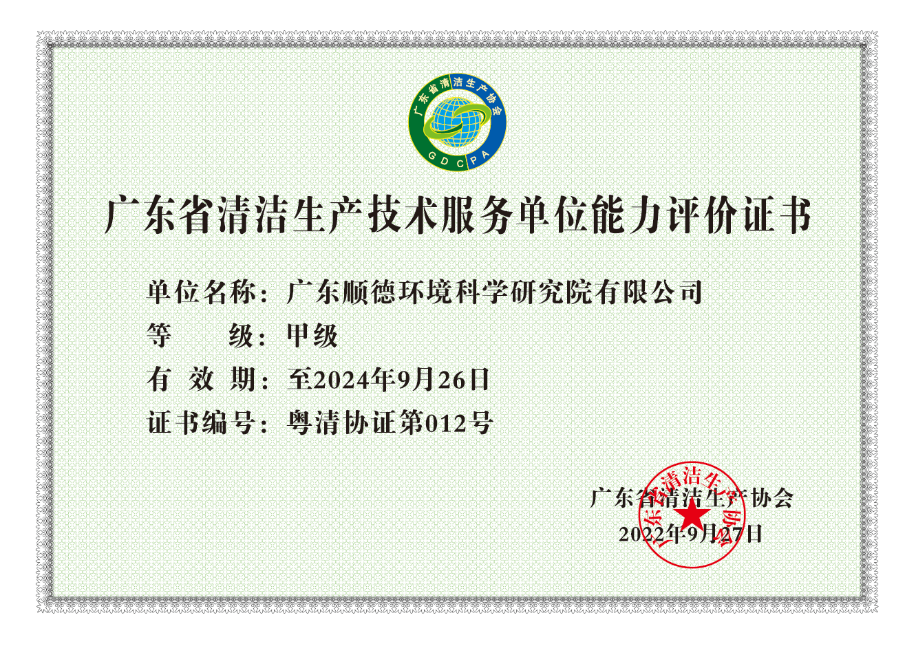 廣東省清潔生產(chǎn)技術(shù)服務(wù)單位能力評(píng)價(jià)證書(shū)
