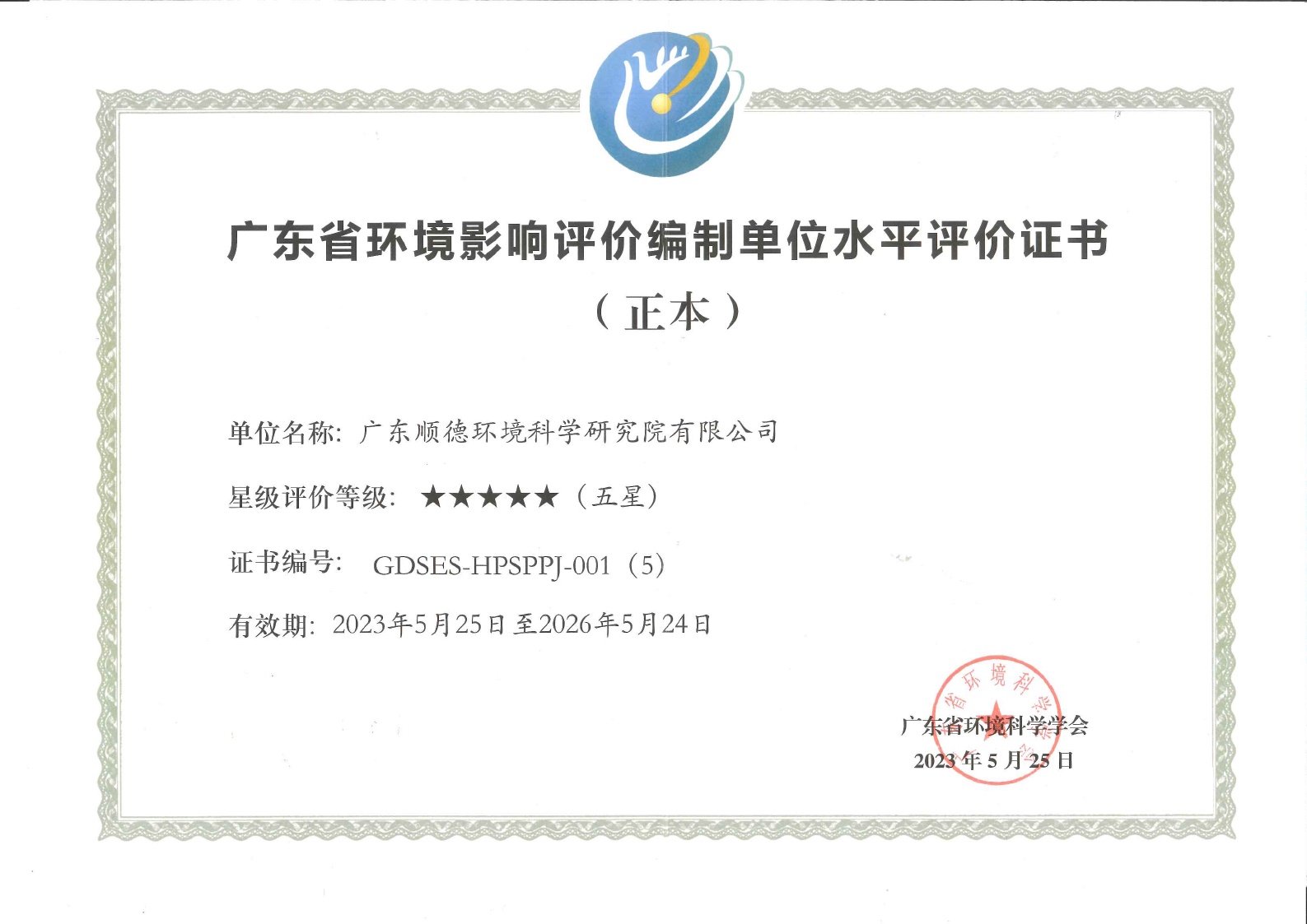 廣東省環(huán)境影響評(píng)價(jià)編制單位水平評(píng)價(jià)五星單位證書(shū)